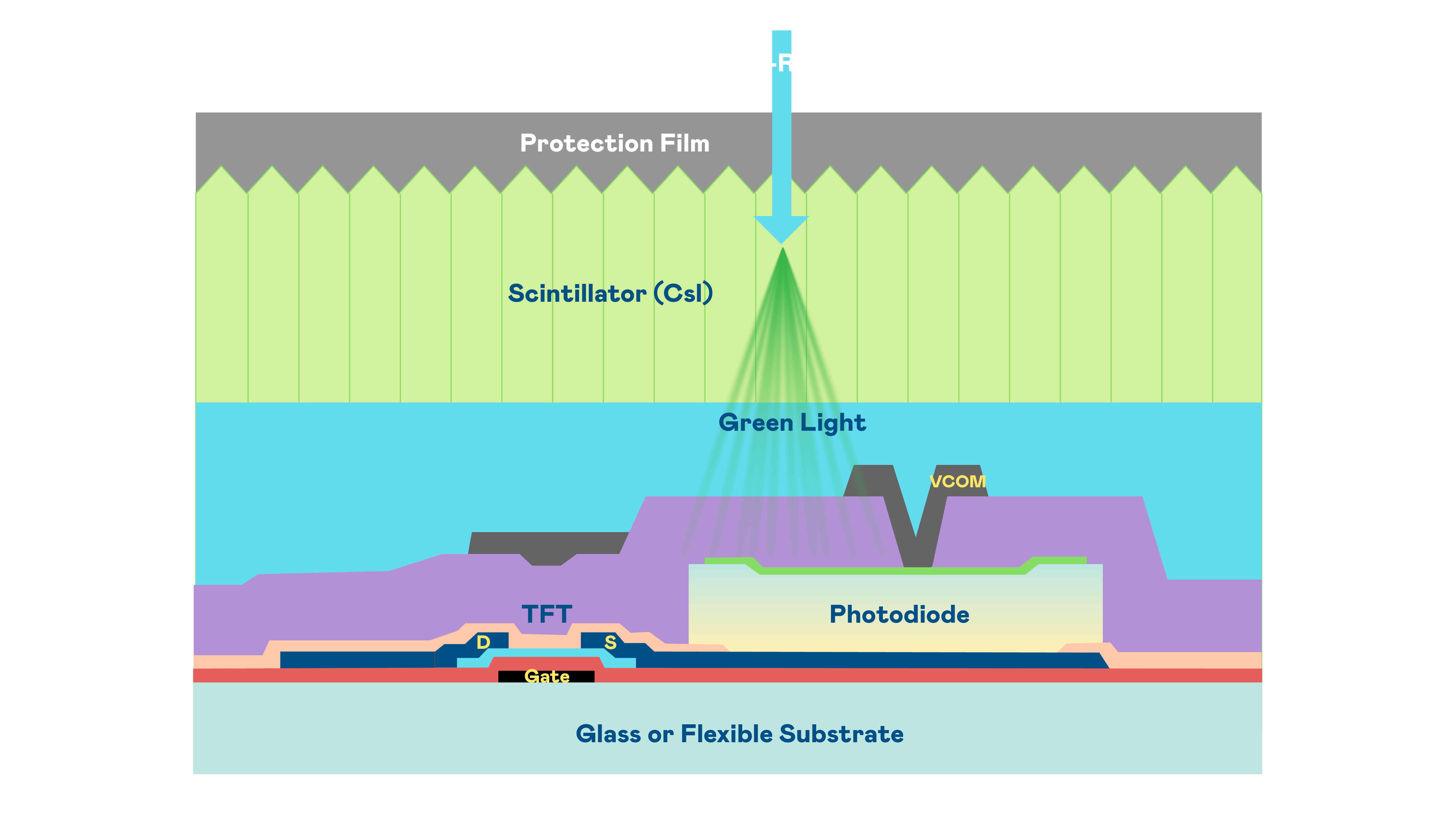 MK体育官网的X光影像感測陣列使用薄膜電晶體 (TFT) 作為每個像素的讀取開關,搭配光電二極體(Photodiode)的光電轉換元件,用以感測X光影像訊號。
